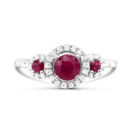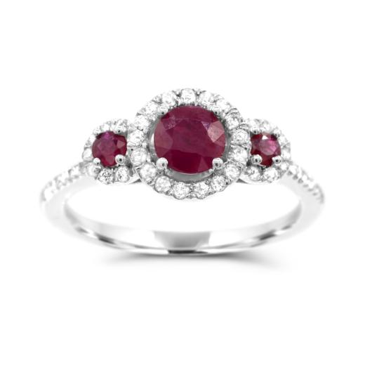 This ring is a true show stopper! This lovely halo design hugs these beautiful rubies with twinkling diamonds. It is a gorgeous piece that makes a real statement. The 14-karat white gold setting is a stunning piece that truly embodies and picture frames these stunning stones.