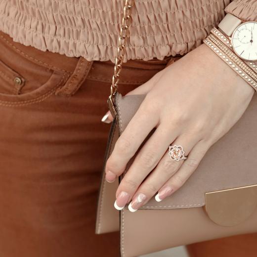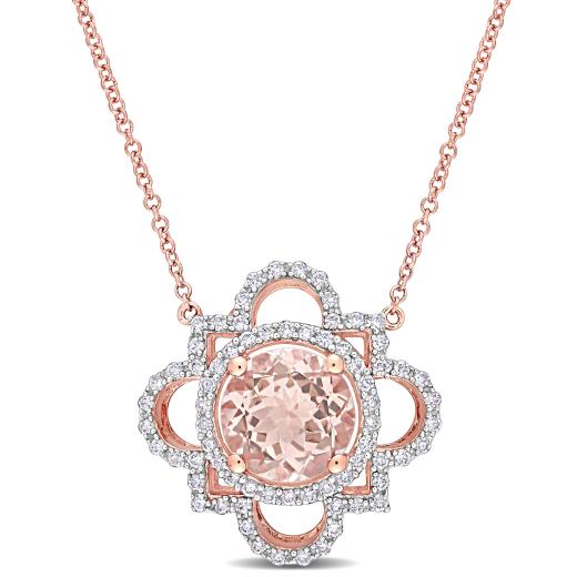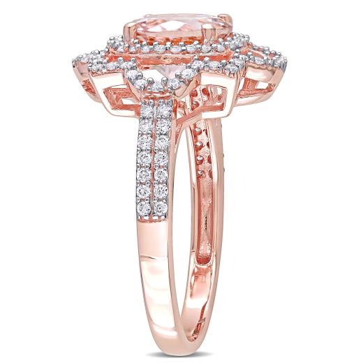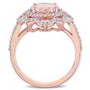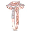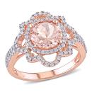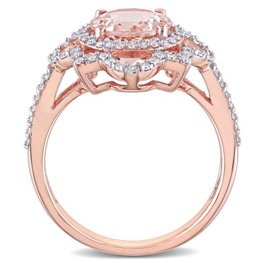 This eye-catching morganite and diamond geometric ring is crafted in 14-karat rose gold and features a round-cut, prong-set morganite gemstone at the center of its unique 95 round-cut, prong-set glistening geometric diamond design. Elegance and sophistication at its finest, this gemstone and diamond ring is sure to make a standout addition to any jewelry collection.