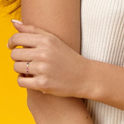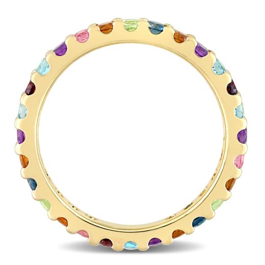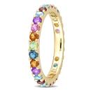 This eye-catching stackable eternity ring is crafted in 10-karat yellow gold. This beautiful anniversary style wedding band features a gorgeous selection of round-cut blue topaz, pink tourmaline, peridot, garnet, amethyst and honey-citrine gemstones along the band. A perfect piece to wear for all occassions, this rainbow gemstone eternity band is sure to make a standout addition to any jewelry collection.