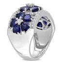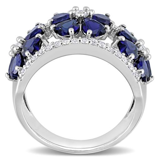 This created sapphire floral cocktail ring is crafted in sterling silver. This modern ring features 15 heart-cut created blue sapphires along with 35 round-cut created white sapphires in a unique triple flower semi-eternity design. Instantly add a touch of color, elegance and class to any ensemble with this stunning gemstone ring. A perfect choice either for yourself or as a special gift for someone you love. This statement ring will make a standout addition to any jewelry collection.