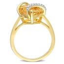This heart-cut citrine swirl cocktail ring is crafted in yellow plated sterling silver. This beautiful crossover ring features a heart-cut, prong-set citrine as its centerpiece and 10 round-cut sparkling diamonds in a unique swirl split shank design. Enhanced with a high polished finish, this pretty gemstone and diamond ring is a valuable addition to any jewelry collection. Treat yourself or a friend to this beautiful cocktail ring.