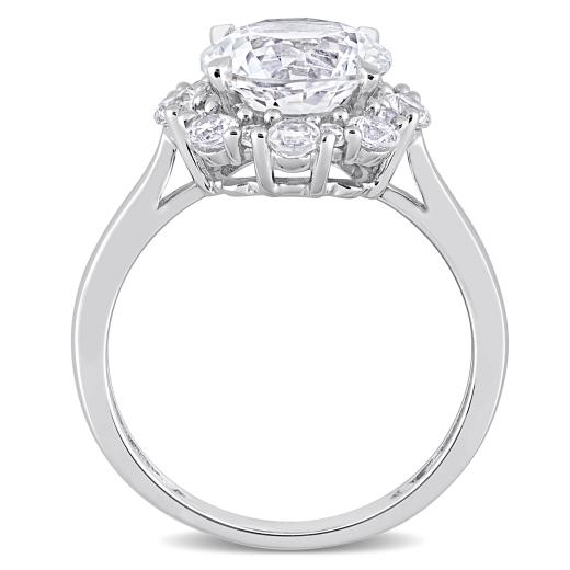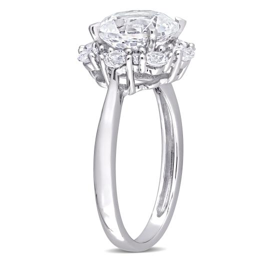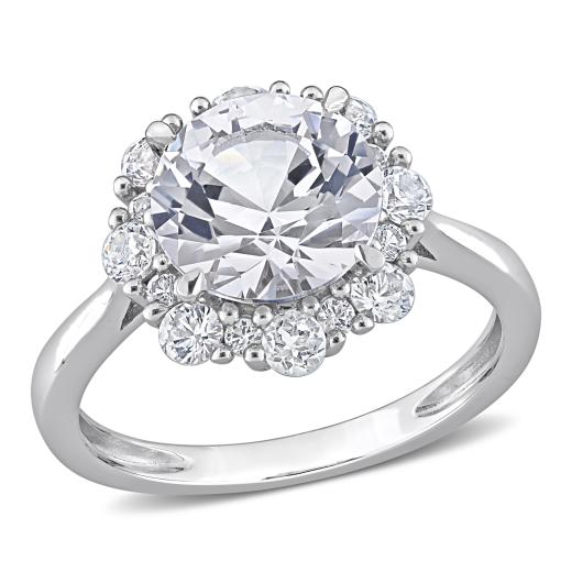 This created white sapphire halo cocktail ring is crafted in 10-karat white gold. This beautiful engagement ring features a round-cut, prong-set created white sapphire at the center surrounded by a halo of 16 round-cut, prong-set created white sapphires in a unique floral bridal design. Enhanced with a high polish finish, this wedding ring is the perfect addition to any jewellery collection. Whether worn as a gemstone bridal or simply a gorgeous gemstone accessory, this jewellery piece is a great gift for a woman with a classic and trendy sense of style.