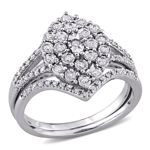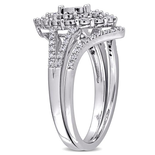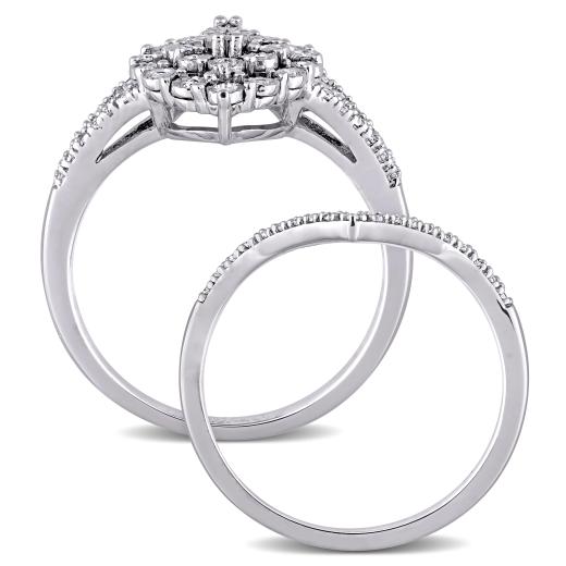This opulent cluster wedding ring set is crafted in sterling silver and features 66 round-cut, prong-set lustrous diamonds clustered in a unique design. Liven up your outfit with this gorgeous composite halo split shank engagement ring and matching contour wedding band and look as luxurious and elegant as the Queen with this bridal set on your finger.