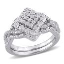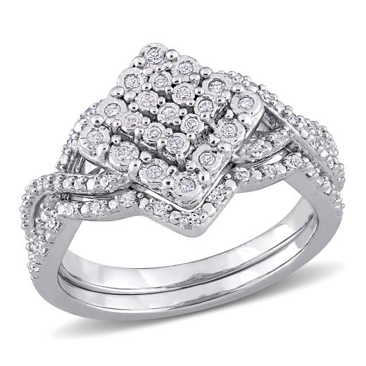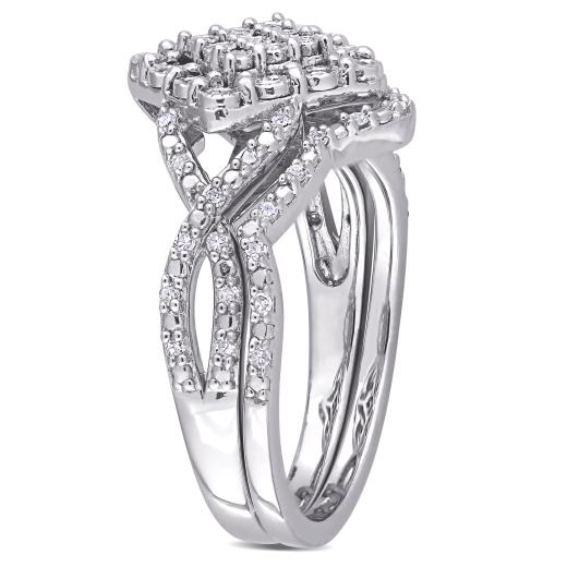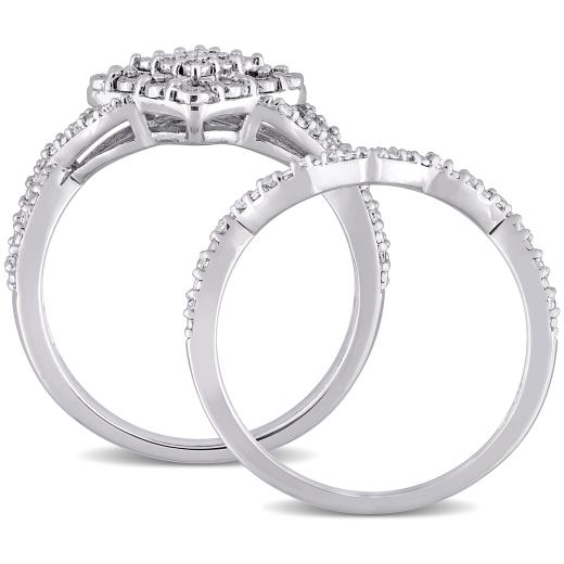 This unique vintage cluster halo wedding ring set is crafted in lustrous sterling silver. This brilliant split shank engagement ring features round-cut, sparkling white diamonds beautifully clustered on the ring. This wedding ring is complemented by a gorgeous matching wedding band. The vintage design gives it depth and sparkle. Enhanced with a high polish finish, this bridal ring set is a valuable addition to any jewelry collection. Celebrate your excellent sense of style with this wedding set.