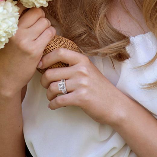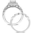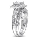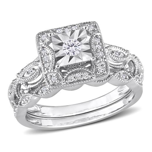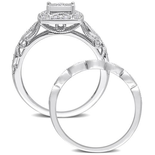This pretty cushion halo bridal ring set is crafted in lustrous sterling silver. This stunning ring set features 28 round-cut shimmering diamonds that are beautifully embellished on the ring in prong and pave settings. This unique wedding ring is complemented by a matching stackable semi-eternity style wedding band. Enhanced with a milgrain finish, this halo diamond bridal ring set is a perfect symbol of your everlasting love and a beautiful addition to any jewelry collection.