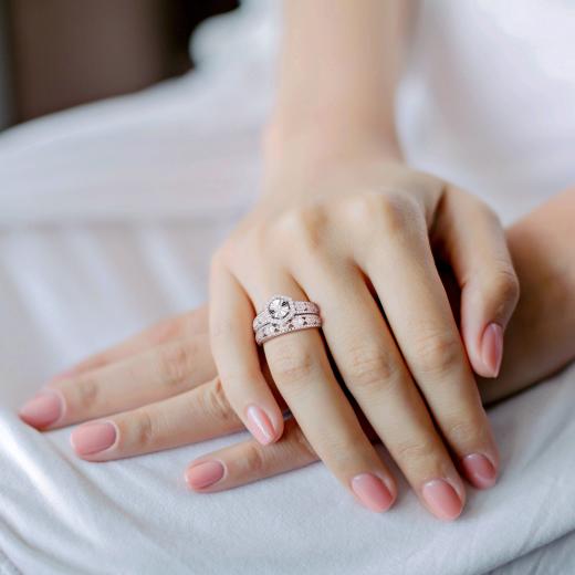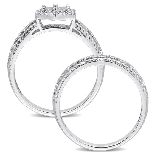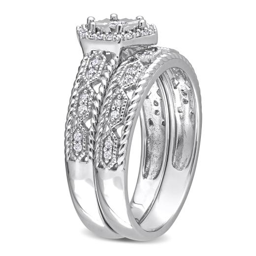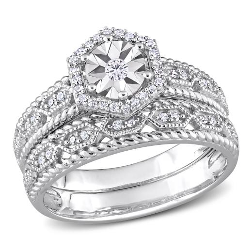 This pretty hexagon halo bridal ring set is crafted in luminous sterling silver. This stunning ring set features 51 round-cut glittering diamonds that are beautifully embellished on the ring in prong and pave settings. This unique wedding ring is complemented by a matching stackable semi-eternity style wedding band. Enhanced with a milgrain finish, this halo diamond bridal ring set is a perfect symbol of your everlasting love and a beautiful addition to any jewelry collection.