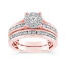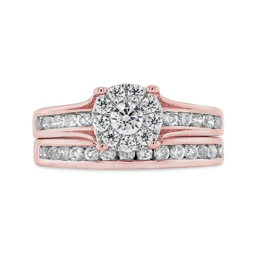 Stunning 10K rose gold sets this bridal set apart from the rest. Proudly displaying 1.00CTW of dazzling round brilliant diamonds, this set is the perfect option for anyone looking for that extra wow factor. With a wedding band that perfectly compliments the engagement ring, this set will sparkle for decades to come.