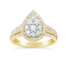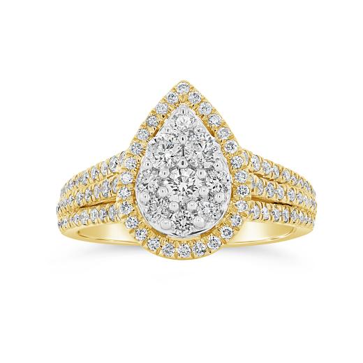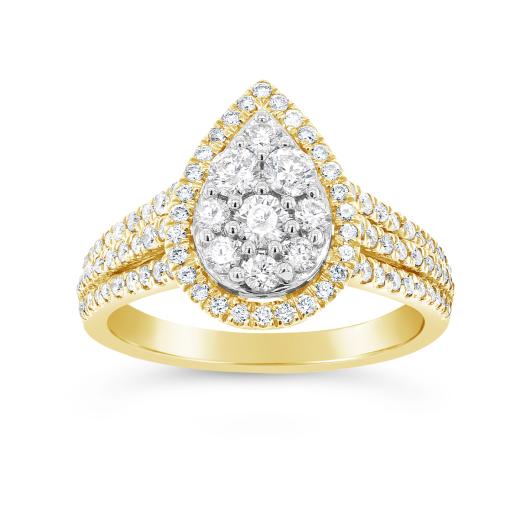 Pop the question with an engagement ring fit for royalty. Boasting 1.00CTW of timeless round brilliant diamonds, expertly crafted into a captivating pear formation, this bridal crossover ring is sure to take her breath away. Crafted in 10K yellow gold with cascading diamonds along the band, she's sure to say "I do" over and over again.