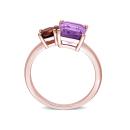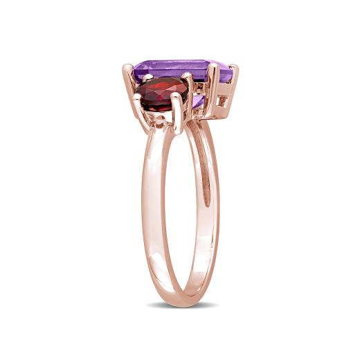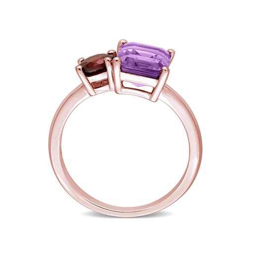 Accessorize boldly with this vibrant two-stone ring. Crafted in lustrous rose plated sterling silver, this glamorous ring showcases one octagon-cut prong-set amethyst and one round prong-set garnet studded elegantly on a sleek band. Enhanced with a polished finish, this exceptional ring can be worn as a statement piece.