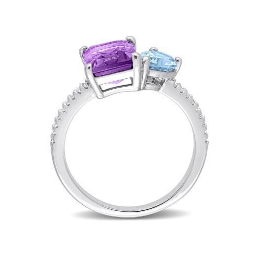 Add a splash of color to your ensemble with this vibrant pear sky blue topaz octagon amethyst and diamond two-stone ring. Crafted in lustrous sterling silver, this unique ring showcases one pear-cut prong-set sky blue topaz, one octagon-cut prong-set amethyst gemstone, and 18 round, buttercup-set diamonds studded along the edges of the sleek band. Enhanced with a polished finish, this stylish ring is a versatile fashion accessory.