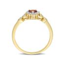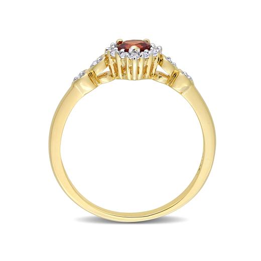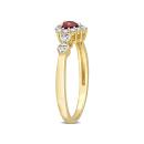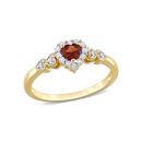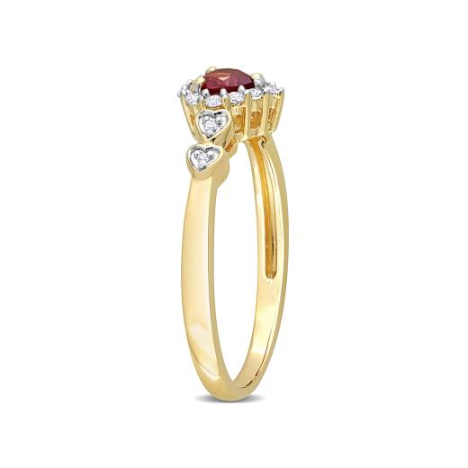 Give yourself a royal look with this vintage heart halo ring. Crafted in lustrous yellow plated sterling silver, this classic ring features a heart-cut, prong-set garnet decorated with a halo created by 12 prong-set created white sapphire gemstones and four pave-set diamonds embellished half way on both sides of the band in heart designs. Polished with a brilliant shine, this promise ring is a perfect gift for impressing your lady love.