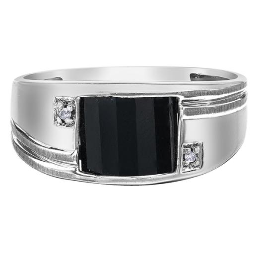 This 10K white gold barrel cut onyx and diamond men's ring is a statement of strength and refinement. The deep, dramatic onyx stone is expertly cut into a sleek barrel shape, while the diamonds add a touch of refined sparkle, creating a striking contrast against the cool white gold setting.