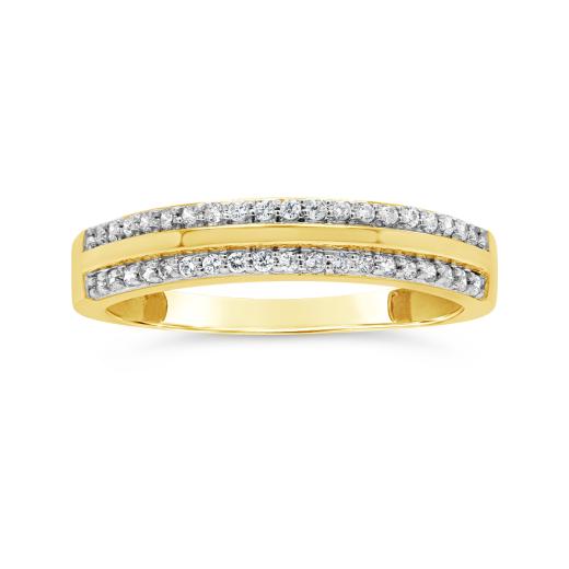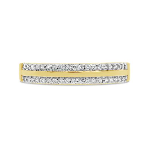 This double row stackable ring is a beautiful and versatile choice.  Its combination of yellow gold, double row design, and sparkling diamonds make it a captivating and stylish ring that can be worn for various occasions and complements a wide range of styles.