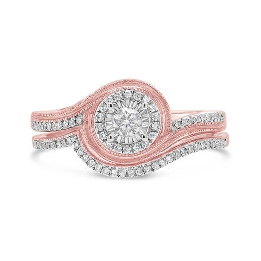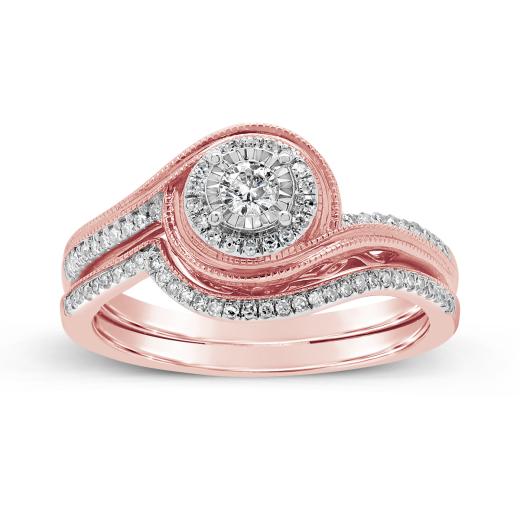This diamond bridal set is a stunning and elegant choice. Its rose gold setting and the shimmering diamonds create a captivating and romantic ensemble that represents love, commitment, and timeless beauty.