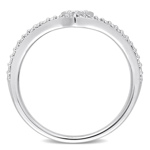 This lovely heart promise ring is crafted in lustrous sterling silver and features three round-cut pave-set twinkling diamond accent studded at the center of the heart motif. The heart design is beautifully set as a crown on the chevron shank which adds sparkle and luster to it. Whether worn as a promise ring or simply a dainty diamond addition, this diamond stacking ring is sure to make a beautiful versatile addition to any jewelry collection. Choose this piece either for yourself or as a special gift for someone you love.