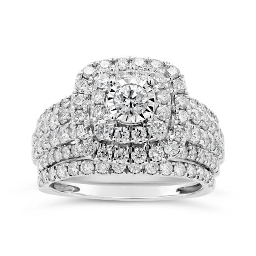 Celebrate the profound journey of love with the exquisite 10K White Gold 2.00CTW Diamond Bridal Set. This enchanting set is a testament to timeless elegance and enduring commitment. The engagement ring features a dazzling array of diamonds, with a brilliant centerpiece diamond. The surrounding diamonds, forming a halo, enhance the ring's allure. The coordinating wedding bands complement the engagement ring with their own shimmering diamonds, creating a harmonious and captivating ensemble. Crafted in lustrous 10K white gold, this bridal set symbolizes the purity and brilliance of your love story. Embark on the next chapter of your life's journey with this stunning and meaningful expression of love.