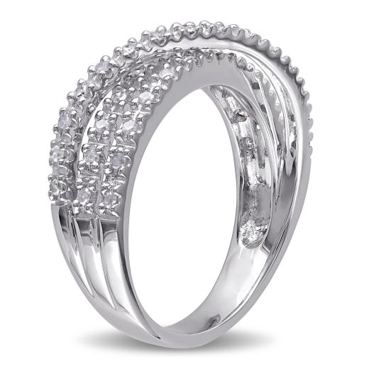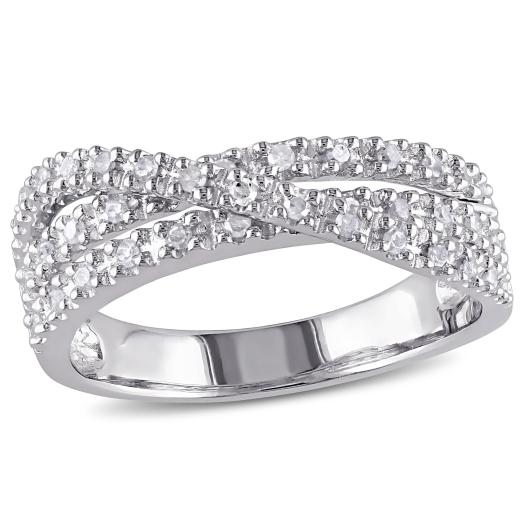 This enchanting 1/4 CT TW Diamond Crossover Ring in Sterling Silver, a dazzling testament to elegance and grace. Crafted with precision and artistry, this ring features a captivating crossover design that symbolizes the intertwining paths of life and love. Adorned with a quarter carat total weight of shimmering round-cut diamonds, each stone is expertly set to maximize its brilliance and sparkle. The sterling silver band provides a timeless backdrop, adding a touch of sophistication to this exquisite piece. Whether as a symbol of eternal commitment or a stylish accessory for everyday wear, this diamond crossover ring is sure to make a statement. Elevate your look with the undeniable allure of this stunning ring, destined to become a cherished addition to your collection.