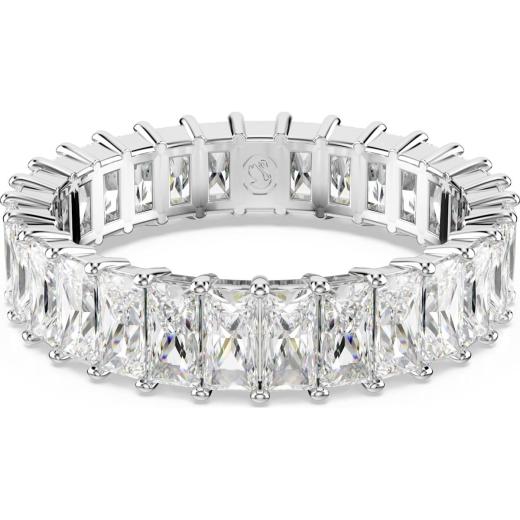 This ring features a striking geometric design, highlighted by shimmering crystals that catch the light with every movement. The modern, sleek setting enhances the brilliance of the stones, creating a bold yet elegant statement piece.
