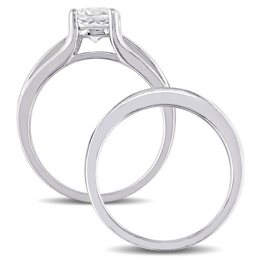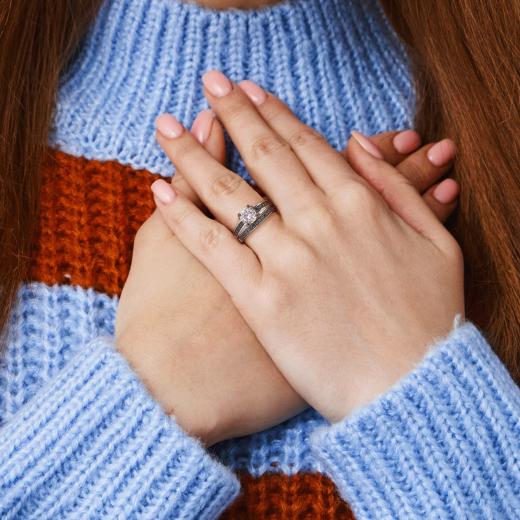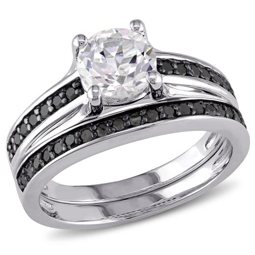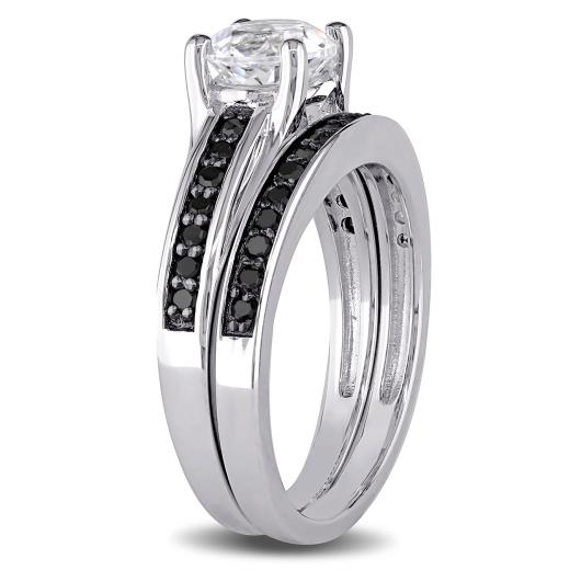 A beautiful symbol of the life you'll share, this Created White Sapphire and Black Diamond Bridal Set is crafted in lustrous sterling silver. This amazing engagement ring features a round-cut (6.5mm) created white sapphire gemstone in the center and 14 round-cut, pave-set black diamonds along the sides. The companion wedding band features a total of 19 fiery round-cut, pave-set black diamonds shimmering along the band. These pleasant looking rings are enhanced with high polish finish.