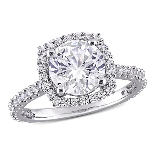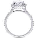 Sparkle with glory when you wear this Created White Sapphire Halo Engagement Ring. Crafted in lustrous sterling silver, this ring features a round-cut, prong-set created white sapphire gemstone (8 x 8mm) at the center with 24 round-cut, prong-set created white sapphire gemstones forming a cushion-shape halo and an additional 28 round-cut, buttercup-set created white sapphire gemstones resting on the band. Enhanced with a high polish finish, this alluring gemstone halo ring makes a stunning addition to any jewelry collection. Coordinate this gemstone ring with any ensemble for a stunning look.