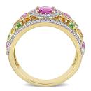 This bold and bright multicolor sapphire, tsavorite and diamond anniversary band is crafted in lustrous 14-karat yellow gold and features round-cut pink, orange and yellow sapphires paired with tsavorites and diamonds in a spectacular cluster design, perfect for all occasions. Instantly add a touch of color, elegance and style to any ensemble with this unique gemstone and diamond ring.