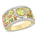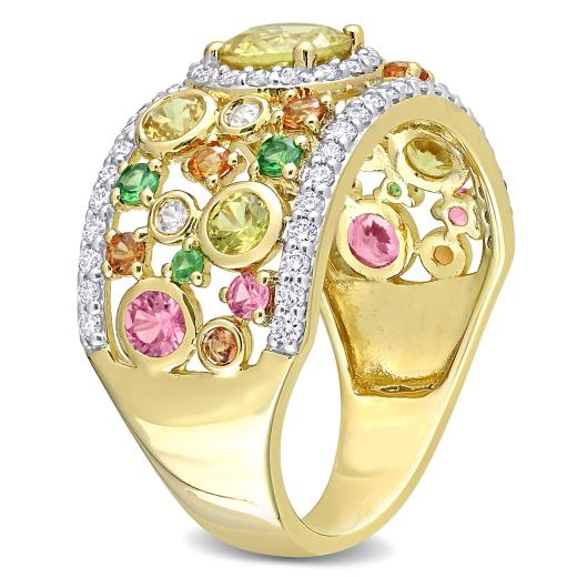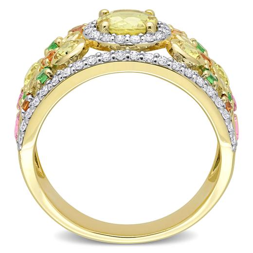This bold and bright multicolor sapphire, tsavorite and diamond anniversary band is crafted in lustrous 14-karat yellow gold and features round-cut yellow, orange and pink sapphires paired with tsavorites and diamonds in a spectacular cluster design, perfect for all occasions. Instantly add a touch of color, elegance and style to any ensemble with this unique gemstone and diamond ring.