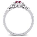 Stand out from the rest as you wear this beautiful Created Ruby, Created White Sapphire and Diamond Accent Heart Promise Ring. Crafted in lustrous sterling silver, this ring features a heart-cut, prong-set glittering created ruby at the center of the ring, surrounded by 12 round-cut, prong-set gleaming created white sapphire gemstones forming a halo and four round-cut, pave-set shimmering diamonds (G-H, I2-I3) adding sparkle on the band. This gemstone and diamond ring has been enhanced with a high polish finish. Sweep her off her feet when you gift her this stunning heart promise ring.