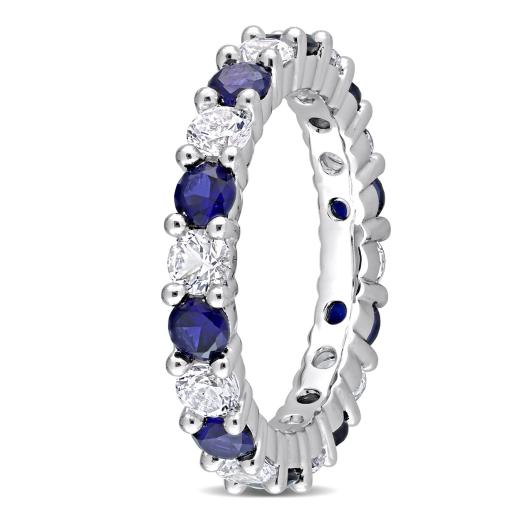 Express your love with this Created Blue and White Sapphire Eternity Anniversary Ring. Crafted in lustrous sterling silver, this ring features 10 round-cut, glittering created blue sapphire gemstones (3.25 x 3.25mm) and 10 round-cut, gleaming created white sapphire gemstones that are embellished on the ring in a prong setting. Coordinate this gemstone eternity anniversary ring with any casual or business attire to look smart and stylish. This enchanting anniversary ring is the perfect choice for your beloved.
