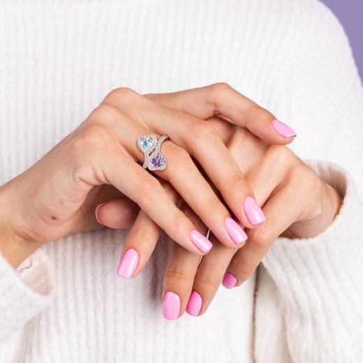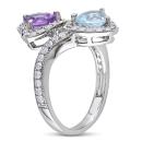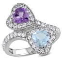 Melt her heart with this Amethyst, Sky Blue topaz and Created White Sapphire Double Heart Bypass Ring. Crafted in lustrous sterling silver and feature two heart-shape, prong-set glittering sky blue topaz and amethyst gemstones (6 x 6mm) studded in a bypass motif. Further, 48 round-cut pave-set created white sapphire gemstone studded in a halo and also augmented on its band. Make her feel like a princess with this heart bypass ring. Enhanced with a milgrain finish, this gorgeous ring is sure to make her heart flutter.