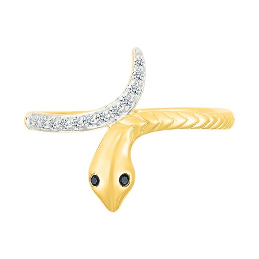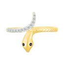 This black & white diamond snake ring in 10K yellow gold embodies the mystique and symbolism of serpents, representing transformation, wisdom, and strength. Designed to wrap gracefully around the finger, this captivating piece features piercing black diamond eyes and a shimmering white diamond-accented tail. The fluid, coiled design mimics the movement of a serpent, making this ring a bold statement of power and elegance.
