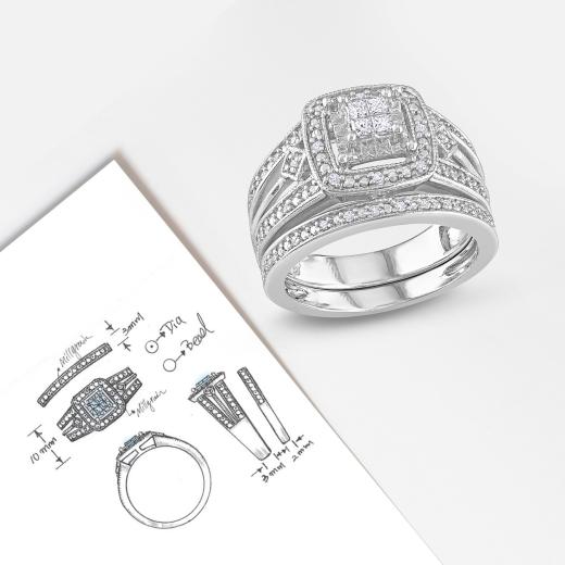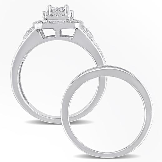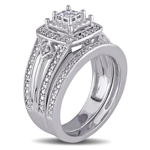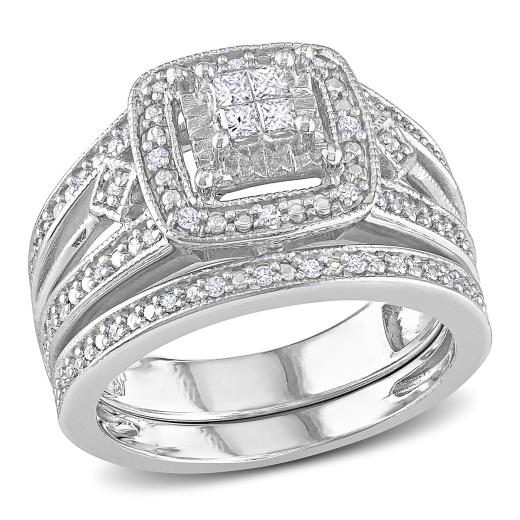 This exquisite 1/4 CT Princess and Round Diamond Bridal Set is crafted in sleek silver, combining the brilliance of both princess-cut and round diamonds. The engagement ring features a dazzling princess-cut center stone, accented by sparkling round diamonds along the band. The matching wedding band is designed to complement with a row of glittering round diamonds, adding extra sparkle. Together, this set forms a harmonious and radiant symbol of eternal love, perfect for the modern bride seeking both elegance and charm.