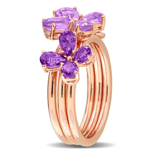 This delicate floral ring set features 1 3/4 carats total weight of soft rose de France African amethyst accented by 1/8 carat total weight of sparkling diamonds. Set in romantic rose plated sterling silver, it offers a graceful and feminine touch with subtle sparkle for everyday elegance or special occasions.