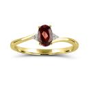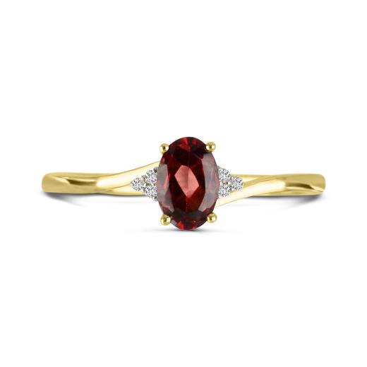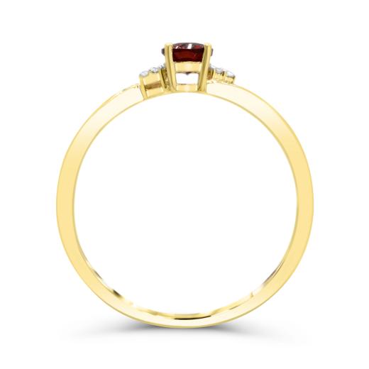 Indulge in the luxe charm of this 10K yellow gold ring, where a garnet gemstone takes center stage. Surrounding the garnet are six shimmering diamonds with a total weight of 0.01 carat, artfully placed to create a delicate halo of brilliance.
