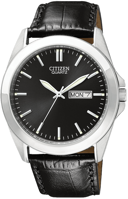Citizen Quartz round stainless steel case, black leather strap, black dial, day-date, 39mm case, WR, buckle