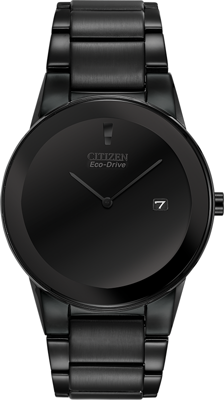 Citizen Eco-Drive round black ion-plated stainless steel case and bracelet, black dial, reverse date window, 40mm case, WR, fold over clasp with push button