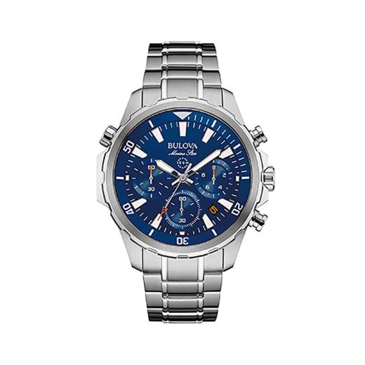 From the Marine Star Collection. Six hand calendar chronograph in stainless steel with silver-tone finish and blue dial, flat mineral glass, screw-back case, fold-over closure with pushers, safety bar and extender, and water resistance to 100 meters.