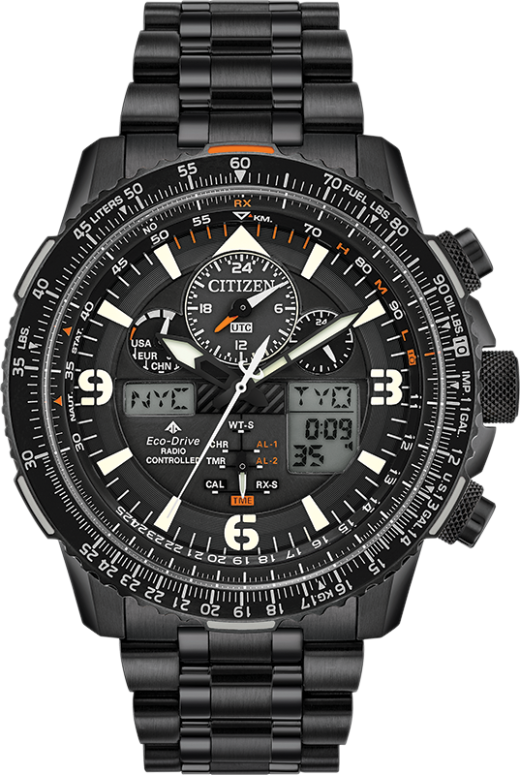 Citizen Eco-Drive round black ion-plated stainless steel case and bracelet, black dial, Atomic Timekeeping, 2 Alarms, 1/100 Sec. Chrono, Push Button Perpetual Calendar, Push Button Power Reserve Indicator, 47mm case, Water Resistant200, Fold Over Clasp with Hidden Push Buttons.