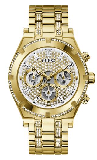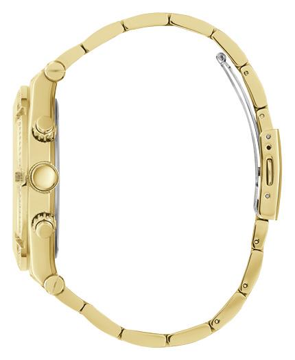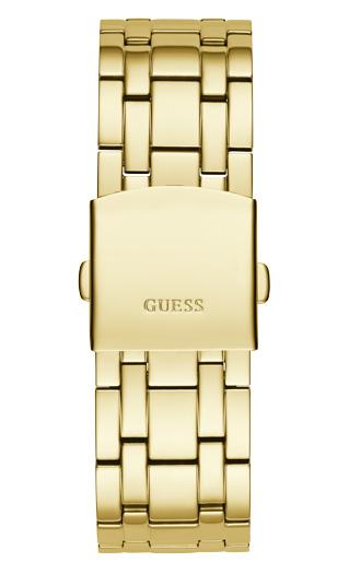 The Guess Men's Gold Tone Watch features a stylish gold-tone stainless steel case and bracelet, offering a bold, sophisticated look. This watch combines modern elegance with reliable functionality, making it the perfect accessory for any outfit.