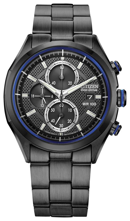 Drive from Citizen Eco-Drive round black ion-plated stainless steel case and bracelet, black dial, 1/5-second chronograph measures up to 60 minutes, 12/24-hour time, date, 41mm, WR100, FCP.