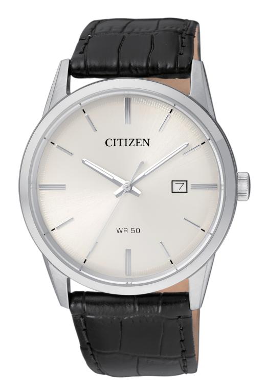 This CITIZEN® Quartz timepiece features a stainless steel case and black leather strap with a silver-tone dial, luminous hands, and date.